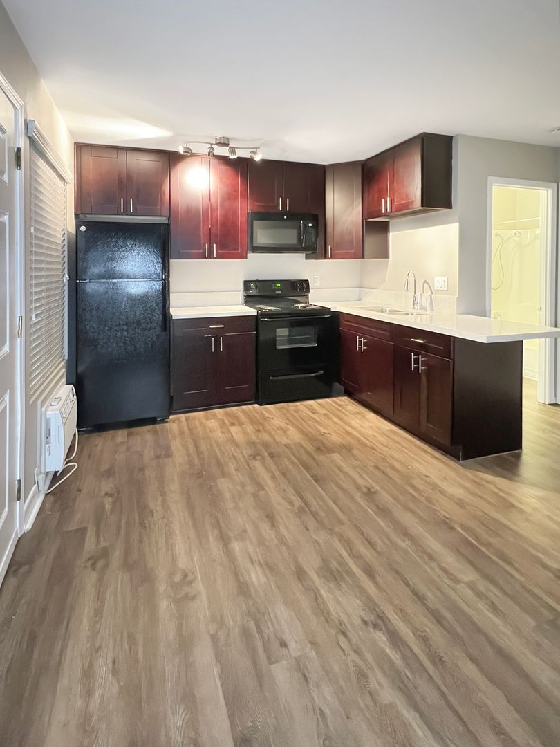 Fully renovated kitchen with custom cabinets, quartz countertops, and black appliances